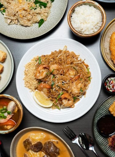 Soft flat rice noodles with egg, vegetables and Thai seasoning.
